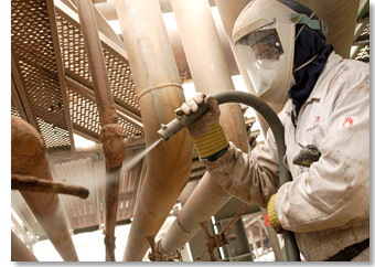 噴砂除銹的原理是利用壓縮的空氣,把一定量的砂子通過噴槍告訴的打到零件銹蝕的表面層,以除掉銹蝕的目的。這種方法不僅除銹非常快,而且為接下來的涂裝、噴涂、電鍍等步驟做好了準備。經過噴砂處理后的工件表面很干凈,有一定的粗糙度,從而提高了覆蓋層與零件表面結合力,這樣提高了涂裝、噴漆及電鍍的效率。